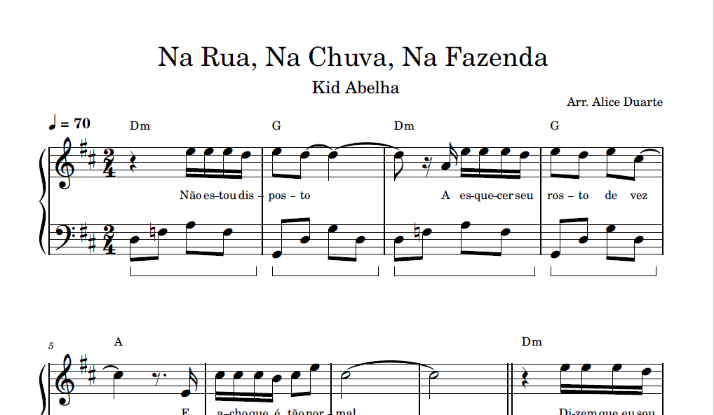 Partitura com a transcrição do arranjo da música “Na Rua, Na Chuva, Na Fazenda”, de Kid Abelha, disponível em vídeo no link do YouTube: Na Rua, Na Chuva, Na Fazenda (Kid Abelha) | Piano Tutorial + Partitura – YouTube