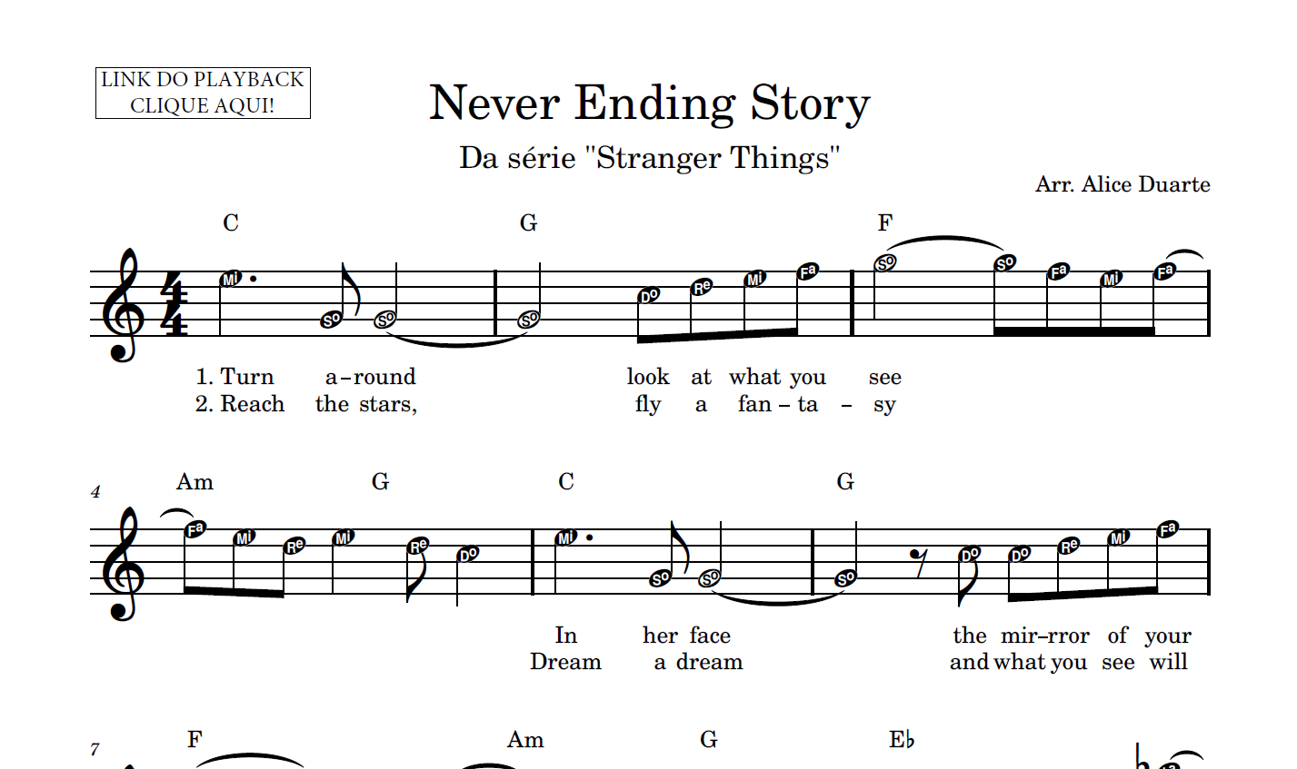 Partitura facilitada com a transcrição do arranjo da música “Never Ending Story”, da série Stranger Things, disponível em vídeo no link do YouTube: Never Ending Story (Da série Stranger Things) | Tutorial | Partitura Facilitada + Playback