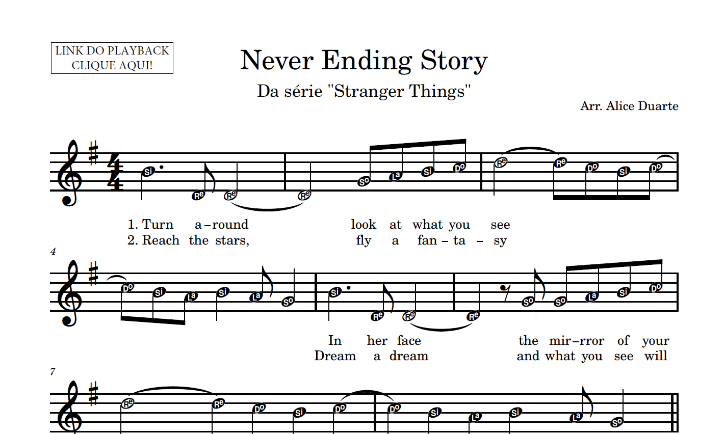 Partitura para instrumentos afinados em si bemol como: Sax Tenor, Sax Soprano, Clarinete em Si Bemol e Trompete em Si Bemol com a transcrição do arranjo da música “Never Ending Story”, da série Stranger Things.