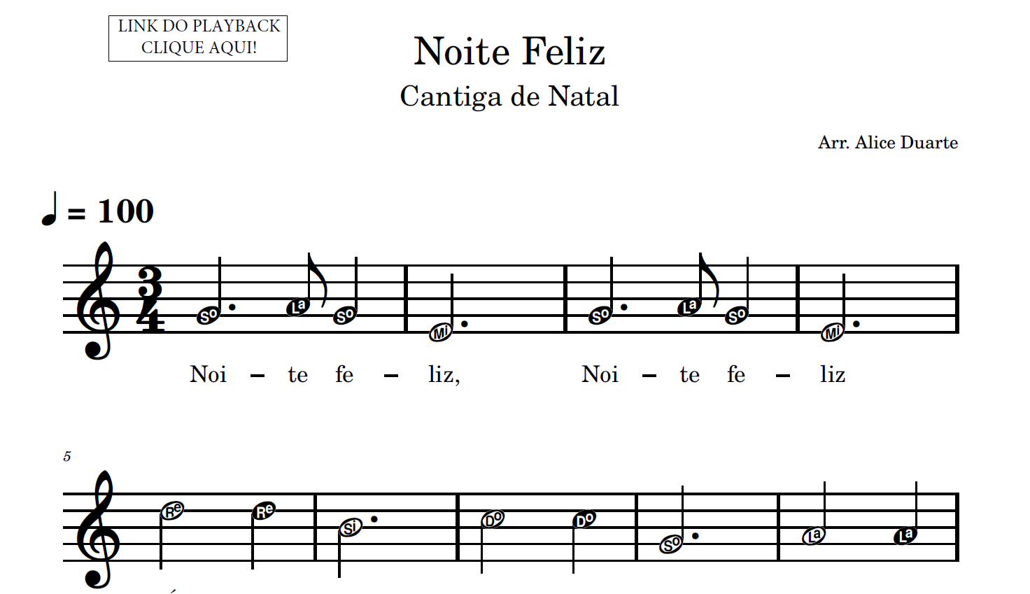 Partitura em formato PDF, com melodia na clave de sol, letra da música, nome das notas e link para o playback utilizado no vídeo.