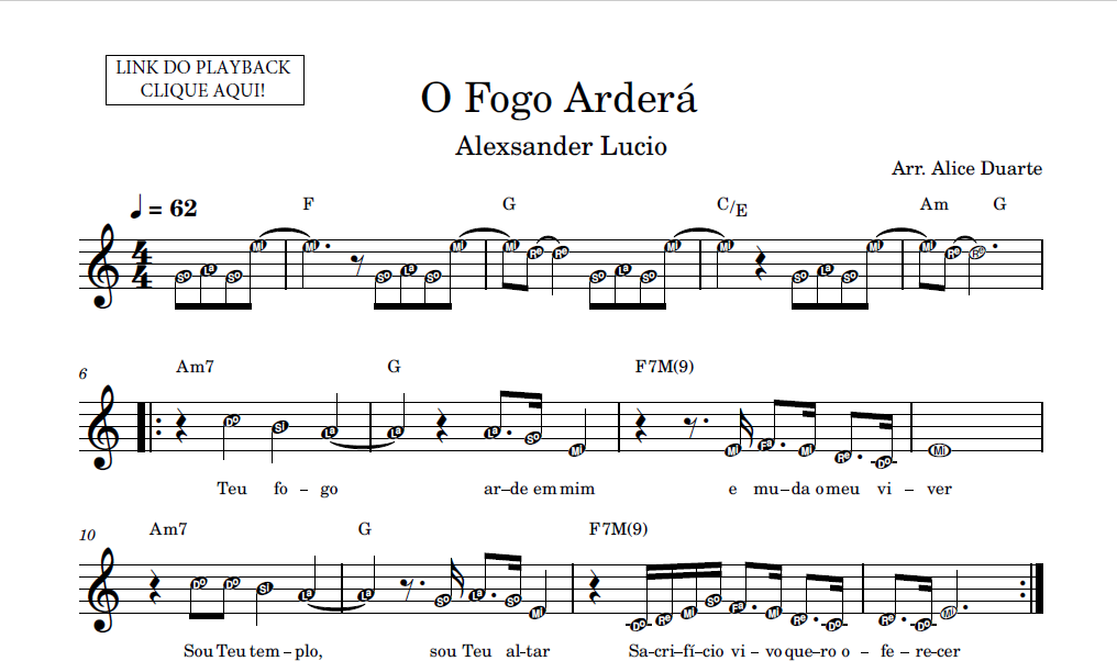 Partitura facilitada com a transcrição do arranjo da música “O Fogo Arderá”, de Alexsander Lucio, disponível em vídeo no link do YouTube: O Fogo Arderá (Alexsander Lucio) | Tutorial | Aprenda a tocar com Partitura Facilitada + Playback