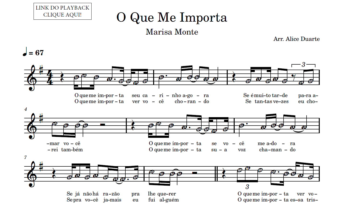 Partitura em formato PDF, com melodia na clave de sol, letra da música, nome das notas e link para o playback utilizado no vídeo.