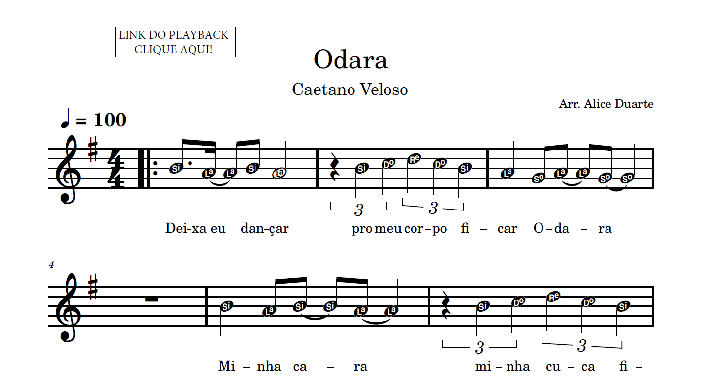 Partitura em formato PDF, com melodia na clave de sol, letra da música, nome das notas e link para o playback utilizado no vídeo.