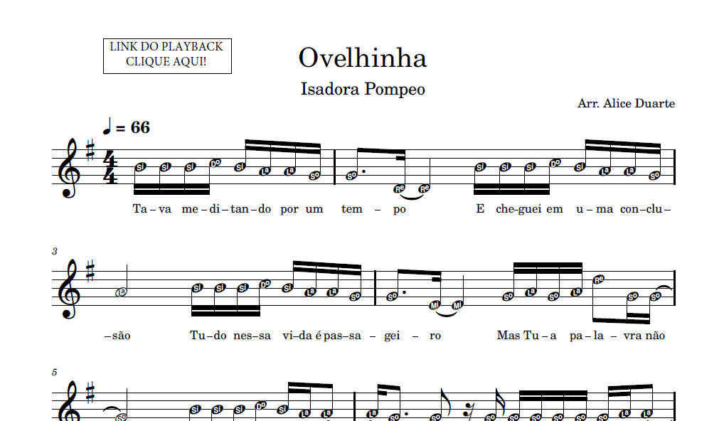 Partitura em formato PDF, com melodia na clave de sol, letra da música, nome das notas e link para o playback utilizado no vídeo.
