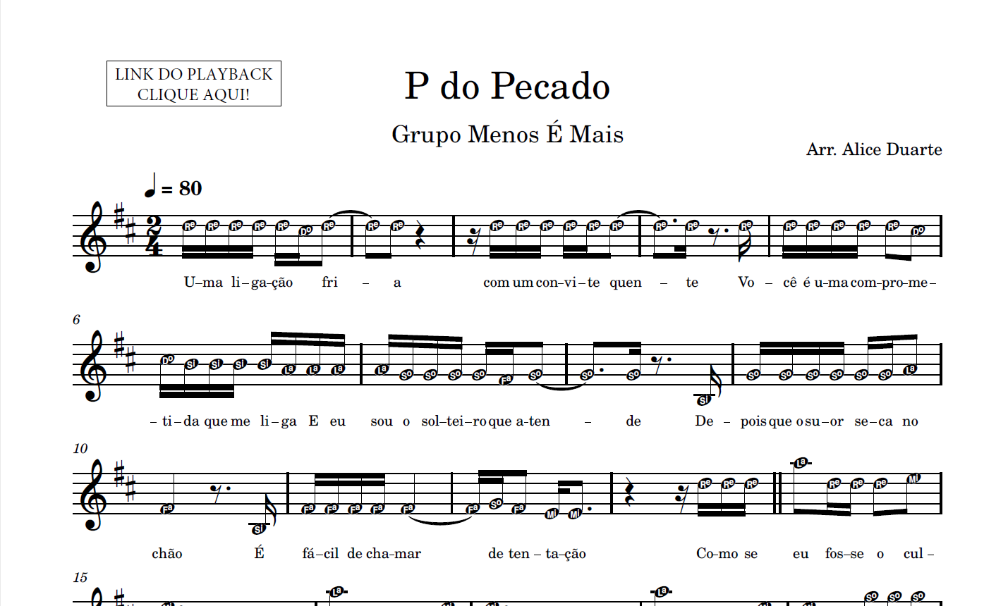 Partitura para instrumentos afinados em si bemol como: Sax Tenor, Sax Soprano, Clarinete em Si Bemol e Trompete em Si Bemol com a transcrição do arranjo da música “P do Pecado”, de Grupo Menos É Mais.
