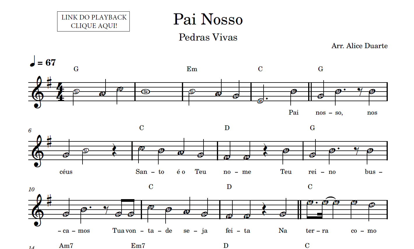 Partitura facilitada com a transcrição do arranjo da música “Pai Nosso”, de Pedras Vivas, disponível em vídeo no link do YouTube: Pai Nosso (Pedras Vivas) | Tutorial | Aprenda a tocar com Partitura Facilitada + Playback – YouTube