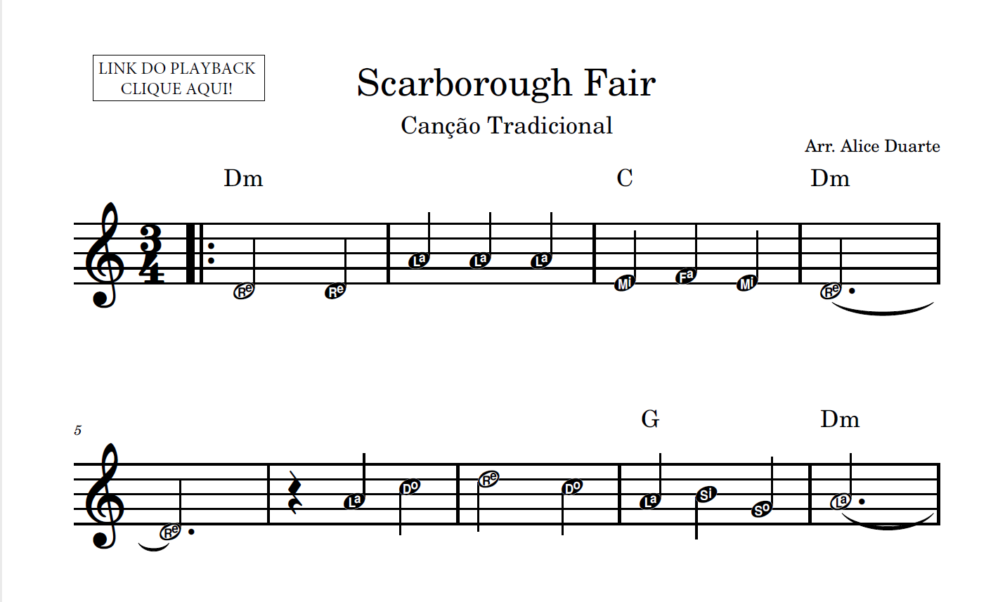 Partitura facilitada com a transcrição do arranjo da Canção Tradicional “Scarborough Fair”, disponível em vídeo no link do YouTube: Scarborough Fair (Canção Tradicional) | Tutorial | Aprenda com Partitura Facilitada + Playback