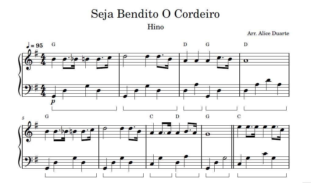 Partitura com a transcrição do arranjo do Hino “Seja Bendito O Cordeiro”, disponível em vídeo no link do YouTube: Seja Bendito O Cordeiro (Hino) | Piano Tutorial + Partitura