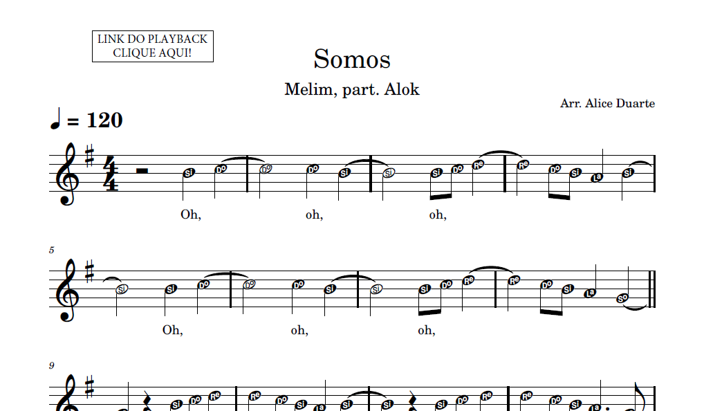 Partitura em formato PDF, com melodia na clave de sol, letra da música, nome das notas e link para o playback utilizado no vídeo.