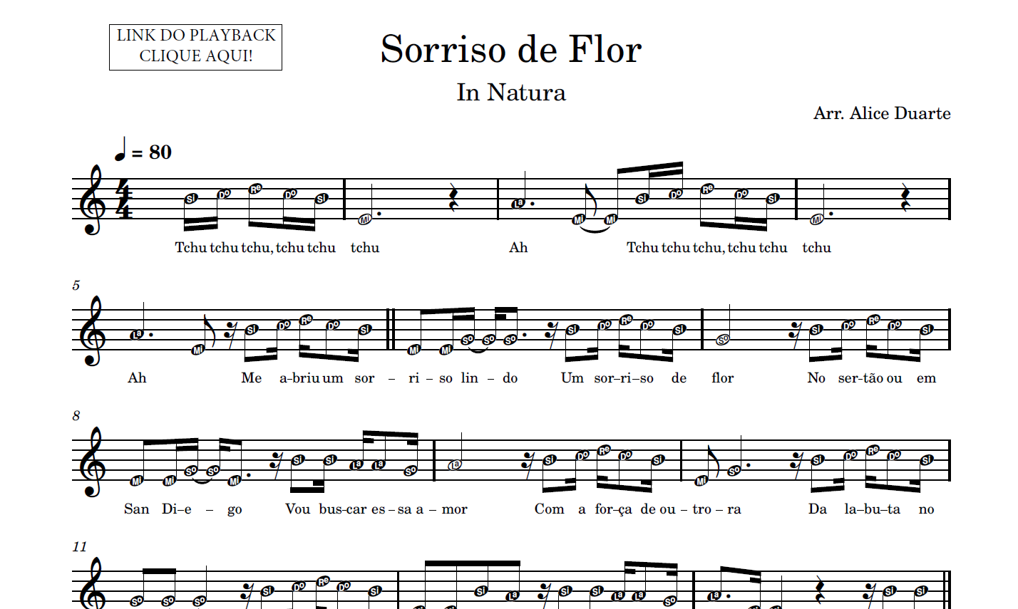 Partitura em formato PDF, com melodia na clave de sol, letra da música, nome das notas e link para o playback utilizado no vídeo.