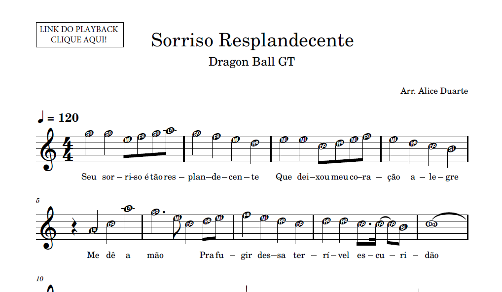 Partitura em formato PDF, com melodia na clave de sol, letra da música, nome das notas e link para o playback utilizado no vídeo.