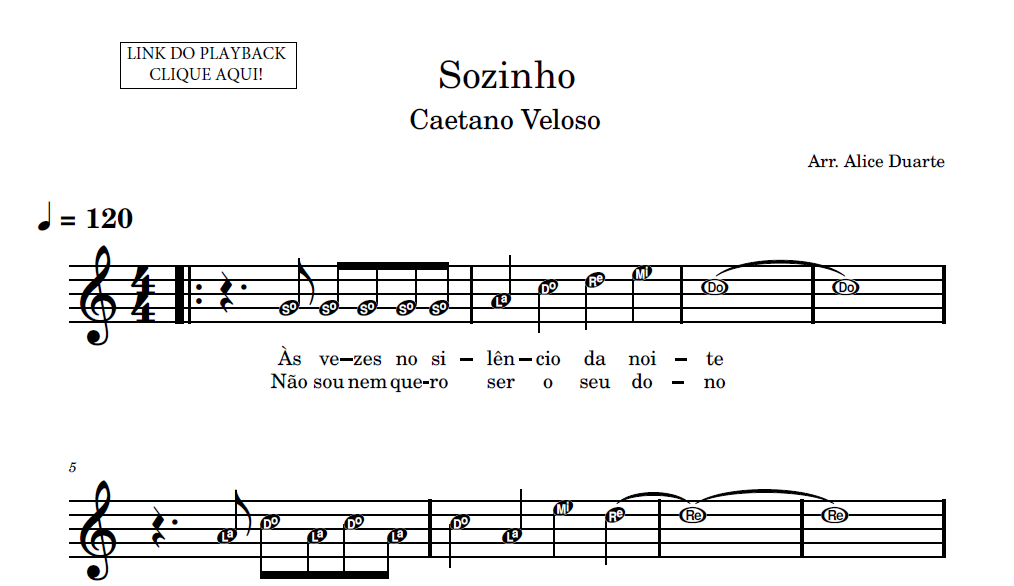 Partitura em formato PDF, com melodia na clave de sol, letra da música, nome das notas e link para o playback utilizado no vídeo.