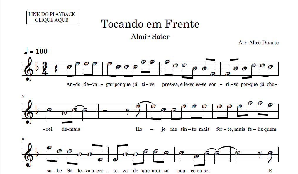 Partitura em formato PDF, com melodia na clave de sol, letra da música, nome das notas e link para o playback utilizado no vídeo.
