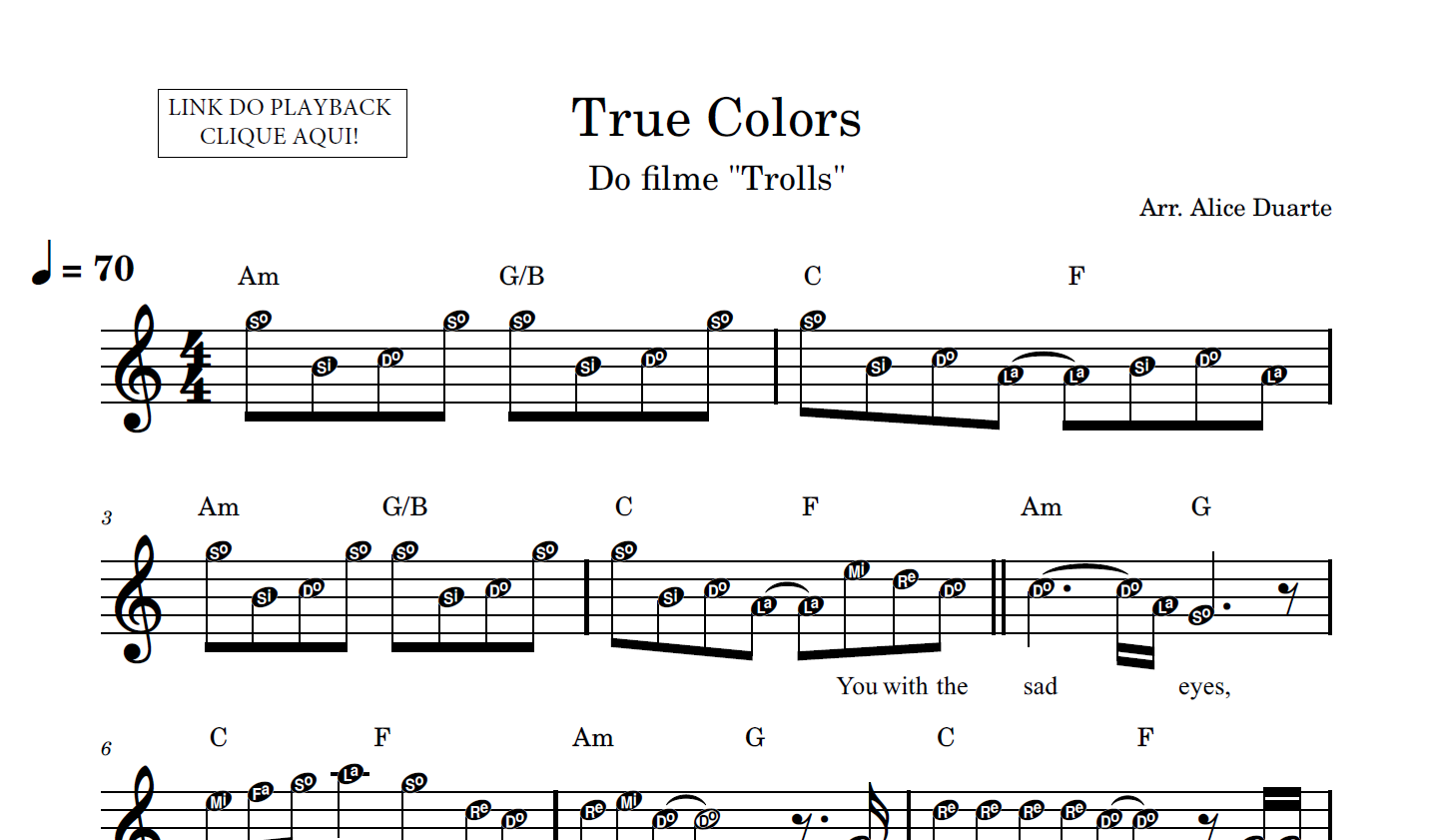 Partitura facilitada com a transcrição do arranjo da música “True Colors”, do filme Trolls, disponível em vídeo no link do YouTube: True Colors (Do filme Trolls) | Tutorial | Aprenda a tocar com Partitura Facilitada + Playback