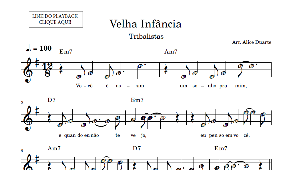 Partitura facilitada com a transcrição do arranjo da música “Velha Infância”, de Tribalistas, disponível em vídeo no link do YouTube: Velha Infância (Tribalistas) | Tutorial | Aprenda a tocar com Partitura Facilitada + Playback – YouTube