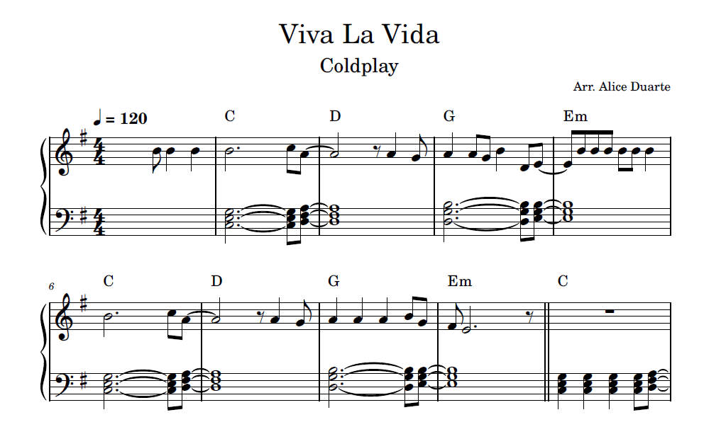 Partitura com a transcrição do arranjo da música “Viva La Vida”, de Coldplay, disponível em vídeo no link do YouTube: Viva La Vida (Coldplay) | Piano Tutorial + Partitura