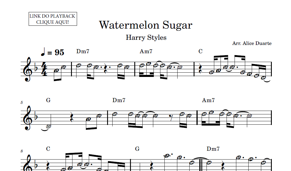 Partitura facilitada com a transcrição do arranjo da música “Watermelon Sugar”, de Harry Styles, disponível em vídeo no link do YouTube: Watermelon Sugar (Harry Styles) | Tutorial | Aprenda a tocar com Partitura Facilitada + Playback – YouTube