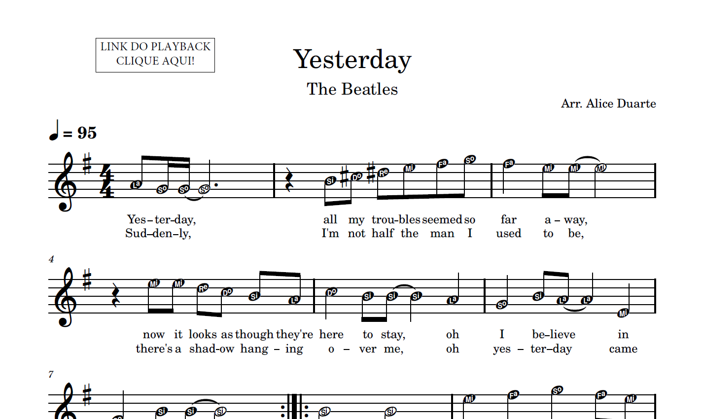 Partitura em formato PDF, com melodia na clave de sol, letra da música, nome das notas e link para o playback utilizado no vídeo.